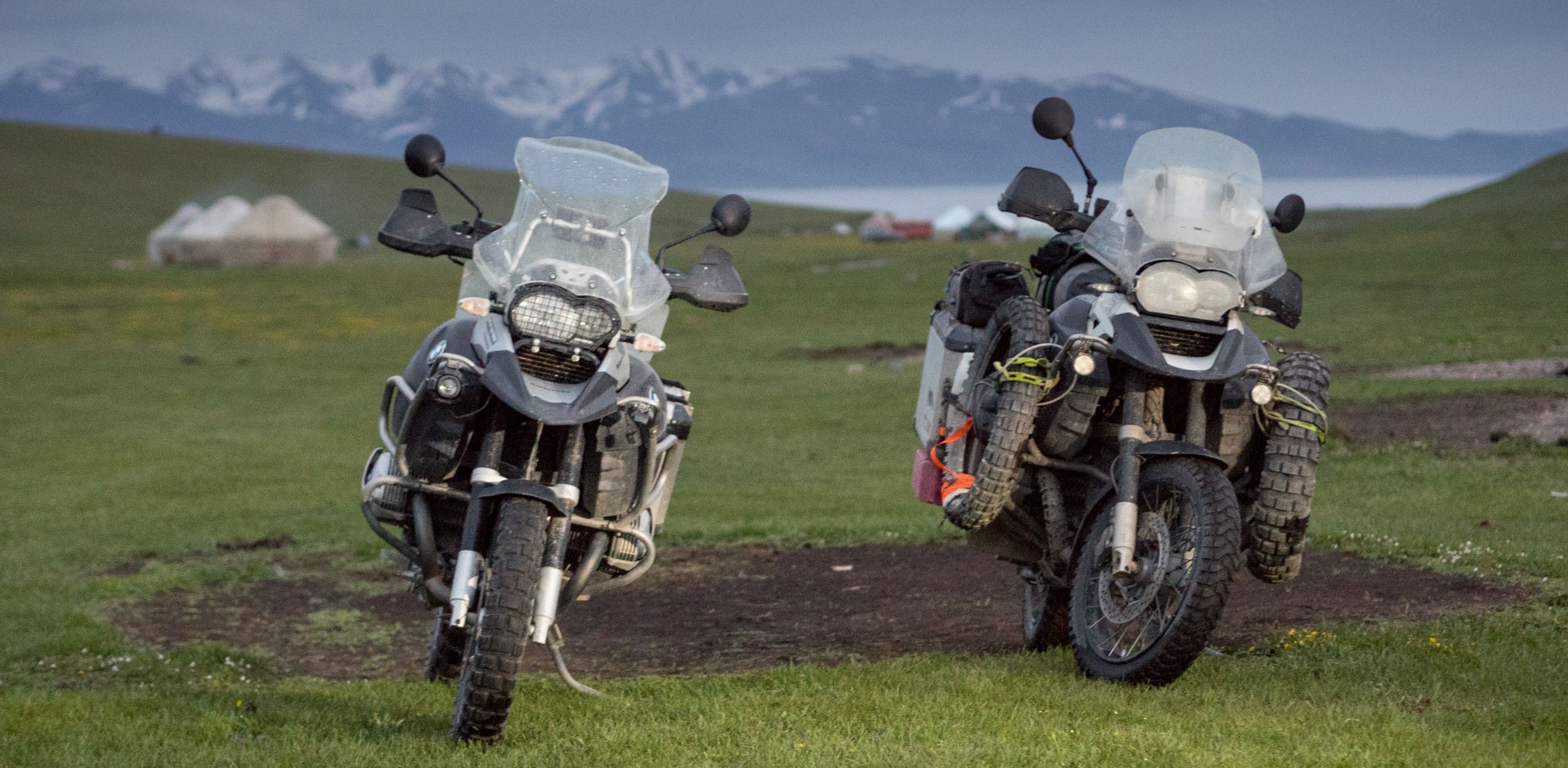 Dafür erreichen wir Son-Kul am nächsten Tag bereits gegen Mittag. Die kirgisische Landschaft unterscheidet sich deutlich vom Pamir. Hier in Kirgisistan regnet es deutlich mehr und es geht meist nur auf ca. 3000 – 4000 Meter hoch. Die Szenarien erinnern eher an die Alpen, mit saftigen grünen Wiesen. Das Ufer des Son-Kul See ist daher gespickt mit vielen kleinen Jurten-Camps der Bauern, die hier ihr Vieh weiden und nebenher ein Homestay betreiben. Wir beschließen, den Tag zu nutzen und den See offroad zu umrunden. Dabei geht es durch recht tiefe Gewässer, bis Erics Maschine bei einer Querung schließlich Wasser zieht. Es bleibt glücklicherweise beim kurzen Schock, wenige später springt das Motorrad weiß qualmend wieder an. Gegen Ende des Sees, als schon fast keine Jurten mehr zu sehen sind, tauchen doch noch vier kleine weiße Zelte im Tal rechts von uns auf. Kurz darauf stapfen uns Marina und Stephane durchs Gras entgegen. Die beiden Endzwanziger-Franzosen verbringen in Kirgisistan ihre Flitterwochen und haben am Vorabend eine kirgisische Hochzeitszeremonie im Camp nacherlebt. Wir beschließen, ebenfalls bei der sympathischen Hirtenfamilie „einzuchecken“.