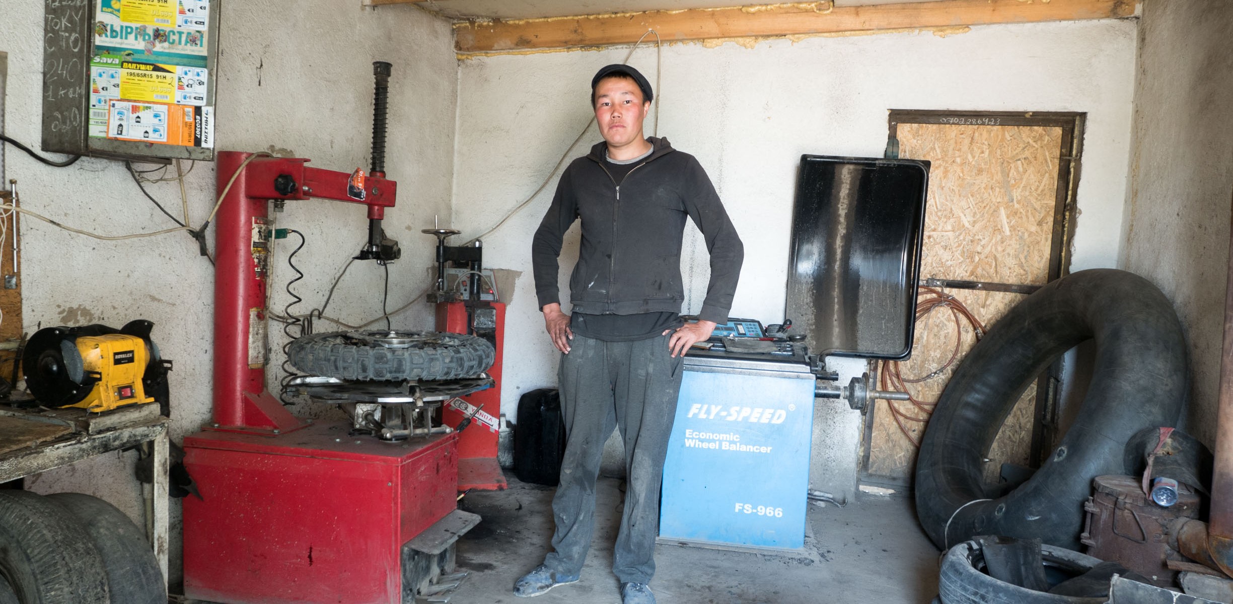 Am nächsten Morgen dann die böse Überraschung. 200 Meter den Pfad hinunter habe ich meinen ersten Platten. Bei den Gewässerdurchfahrten des Vortages scheint ein Stein die Seitenwand des Vorderreifens beschädigt zu haben. Für die Lauffläche hätte ich Flickzeug gehabt. Wir versuchen das Leck behelfsmäßig mit Gummimasse abzudichten, doch das bringt wenig. Immerhin, einige Zeit scheint der Reifen die Luft zu halten. So quälen wir uns endlose 80 Kilometer, mit ständigem Aufpumpen den Schotterweg entlang, in die nächste Ortschaft. Dort klebt mir der 22jährige Azkhar in einer Reifenbude am Straßenrad, ein ordentliches Stück Gummi von Innen in den Reifen. Wenigstens bis nach Korokul, am Ostrand des Issik-Kul Sees, schaffen wir es an dem Tag noch. Wir kommen in einem Hostel unter, in dem sich jede Menge Youngster aus Polen, Estland, Tschechien und Finnland zum Wandern tummeln. Scheinbar ist Kirgisistan der neueste Trend unter den Studies dieser Länder.