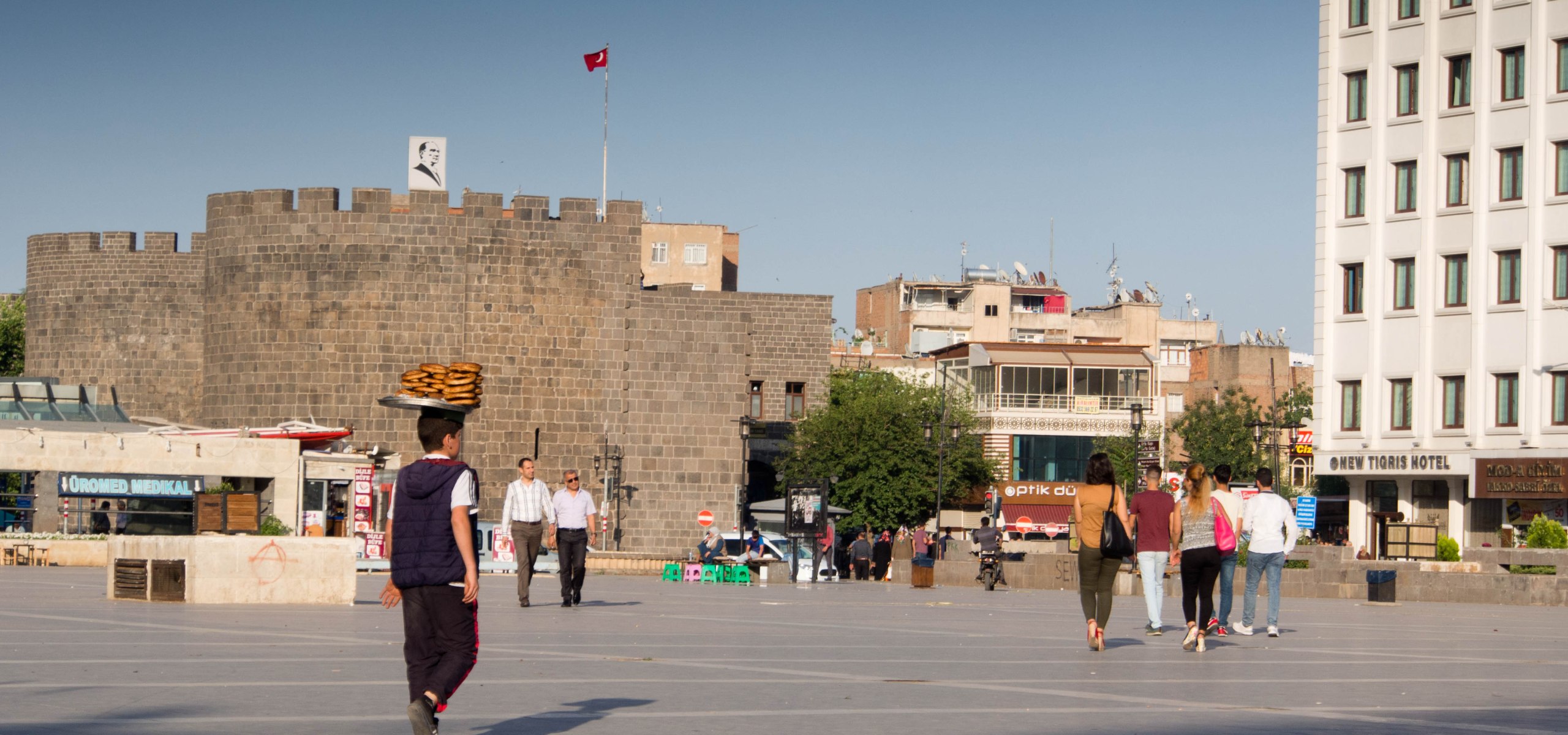 Diyarbakir, die Stadt vor der mich so viele gewarnt haben: Seit ich in der Türkei unterwegs bin, habe ich versucht, mir ein Bild über die Sicherheitslage in Kurdistan zu machen, indem ich mit möglichst vielen Menschen darüber gesprochen habe. Die Meinungen reichten dabei von „Bist Du wahnsinnig? Fahr‘ auf keinen Fall dorthin, da sind die Terroristen“, meist von den eher nationalistisch eingestellten Türken ausgesprochen, bis hin zu „Klar kannst Du da hinfahren, die Kurden sind sehr gastfreundlich“, von den eher linksgerichteten Gesprächspartnern. Nachdem ich eine Nacht im wunderschönen Sanliurfa verbracht habe, laufe ich nun durch den Stadtteil Sur innerhalb der antiken Stadtmauer von Diyabakir. Auf dem Weg zwischen Sanliurfa und Diybakir bin ich durch einige türkische Kontrollposten gefahren, konnte jedoch immer problemlos passieren. Auch hier in Diyarbakir ist die türkische Polizei allgegenwärtig. Auffällig sind die riesigen türkischen Flaggen, die überall aufgehängt wurden, ganz so, als wolle man keinen Zweifel daran lassen, wer hier das Sagen hat. Die Lage scheint eher ruhig, ich möchte trotzdem kein Risko eingehen, halte mich mit Fotos in der Nähe der Polizeiposten eher zurück. In Sur begegnen mir die Menschen überwiegend mit einem Lächeln. Leider beschränkt sich die Konversation dann doch eher auf Zeichensprache. Mit Englisch ist hier im Osten nicht mehr viel zu erreichen. Der Rezeptionist in meinem Hotel versucht trotzdem geduldig, sich mit mir zu unterhalten. Lokman, so heißt er, ist 21 und gerade von seinem einjährigen Wehrdienst zurück. Ob er dabei auch gegen Kurden, also seine eigenen Leute eingesetzt wurde, will ich wissen. „Zum Glück nicht, ich war die ganze Zeit in Ankara stationiert.“ antwortet er.