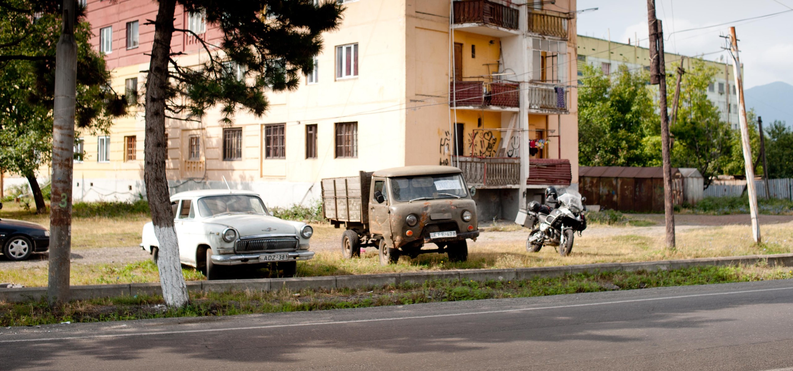 Ich komme gut voran auf dem Weg von Van in Richtung Georgien. Zwischen Igdir und Kars fahre ich einige Kilometer parallel zur armenischen Grenze. Die Tatsache, dass diese Grenze auf beiden Seiten komplett geschlossen ist, wirkt befremdlich auf mich. Wer vom einen in das andere Land möchte, muss grundsätzlich über ein Drittland reisen. Es dämmert bereits, als ich schließlich die georgische Grenze in den Bergen des Kleinen Kaukasus erreiche. Vor dem Abfertigungshaus lungern ein paar Grenzer herum. Einer ruft: „Germany?“ und fügt, als ich bejahe, hinzu: „Merkel very bad, you know!“. Nachdem ich das unkooperative Gehabe der türkischen Beamten hinter mich gebracht habe, stehe ich vorm georgischen Pendant: „First time in Georgia?“ Ich nicke und er lacht mich freundlich an und sagt: „Welcome to Georgia!“