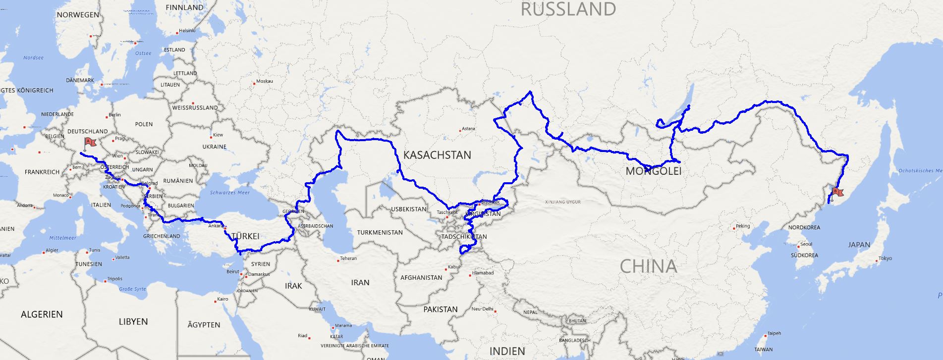 Auf diesem Blog berichte ich über meine Motorradreise rund um den Globus. Im Frühjahr 2016 habe ich begonnen, der Flüchtlingsroute entgegen, von Stuttgart aus in Richtung Iran zu fahren. Leider hat mir die iranische Regierung das Visum verwehrt, weshalb die Reise in Kurdistan endete. Darauf hin entschloss ich mich das Motorrad stehen zu lassen und einige Monate später die Reise in Richtung Nord-Osten fort zu führen. Inzwischen parkt das Motorrad in Almaty, Kasachstan. Im Juni wird es weiter gehen, wahrscheinlich erst einmal nach Kirgisistan und dann in Richtung Novosibirsk.